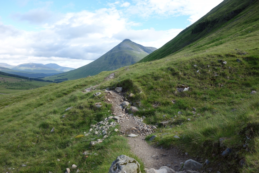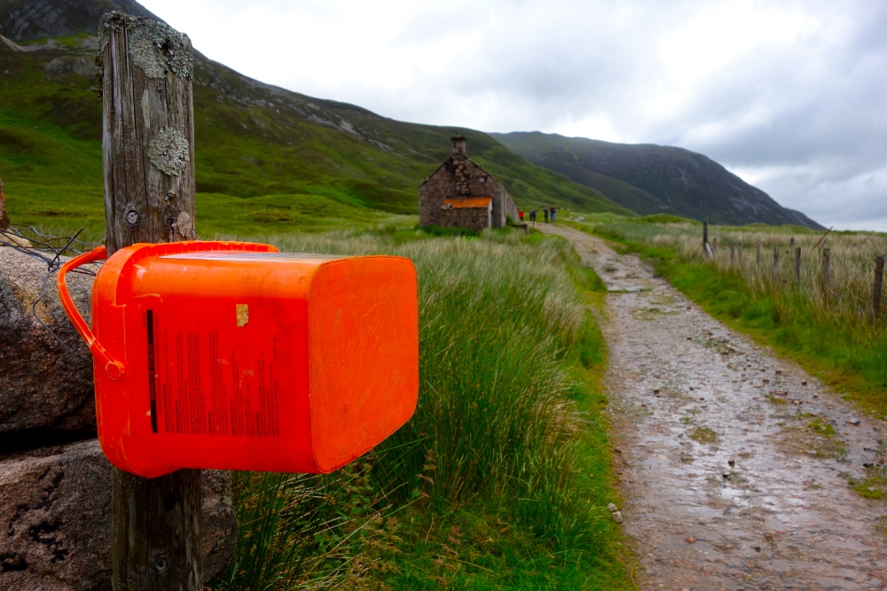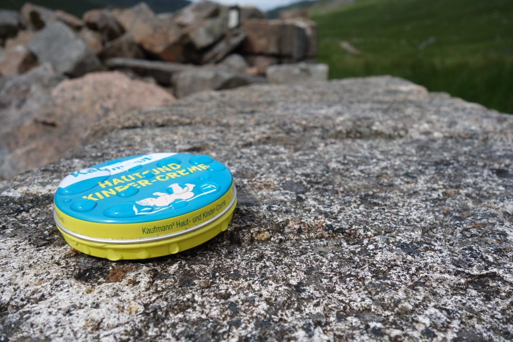 After I found the right way, I met the hikers from two days ago again, the ones who had traveled by train between starting points. After reaching the top of the hill, or rather a saddle between hills, the way got a lot easier. Mostly flat, but sometimes the way would turn into a small stream for a few meters – a stream would have crossed the way, but eroded itself a new path on that way. So I had to balance across stones to keep my shoes dry. The West Highland Way passed two abandoned farm houses (Tigh-na-sleubhaich farm and Lairigmor farm – a lot of abandoned houses today ….). Judging by the farming equipment still lying around, those farms could not have been left behind long ago. But the ruins of the actual houses looked like they were exposed to weather and time for at least hundred years. A funny side note: on the rubble pile, that was Lairigmor farm, I found a can of „Kaufmann’s Haut- und Kinder-Creme“ … the germans are everywhere!