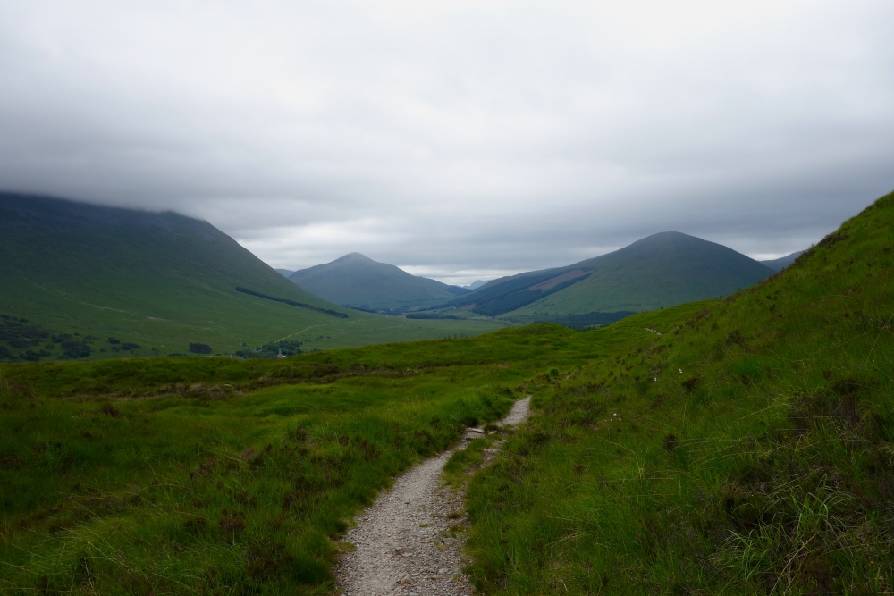 The first half of this part of the West Highland Way for today led me to the Devil’s Staircase. It was the steepest part of the way and ended on the highest point of the entire way – 550 m above sea level. Sadly, it was raining and windy again and I didn’t want to stay on the top to take some photos. But I met a guy there, who refilled the Honesty Box – or better: Honesty Tents – on top. He had already passed me on the way up – and I thought, I was fast. We chatted a while about my trip and the Irn Bru I just bought. He told me, it was even surpassing Coca Cola in sales in Scotland, but was hardly available anywhere else in the world.