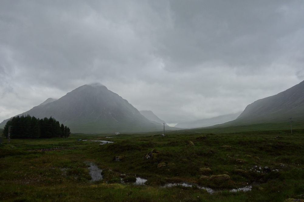 After having climbed a small hill, it started to rain lightly. From now on, it wouldn’t stop until after I had already reached my destination. And the drizzle would turn to real rain soon after. The last 15 km started on an almost cobblestone-like road. Wet from the rain, they were quite hard to walk and this road led through an open area known as Rannoch Moor. I guess, on a nice day, the view must be beautiful, but this was no nice day. The wind kept blowing me rain into my face, my trousers were totally soaked and using my camera or phone to take a picture resulted only in blurry crap. The best thing I could do was putting on some good Death Metal and kept walking until I reached Kingshouse.